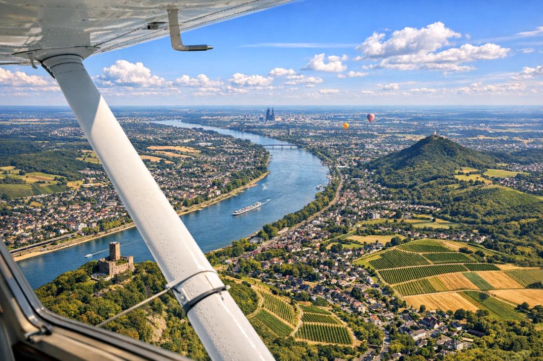1. Rheintal-Rundflug ab Bonn-Hangelar: Eine 45-minütige Route entlang des Rheins von Bonn bis Düsseldorf mit Blick auf Drachenfels, Siebengebirge und Medienhafen. Wer sich über Ausflugsziele im Rheinland informieren möchte, findet dort weitere Inspirationen für Bodenerkundungen nach der Landung.